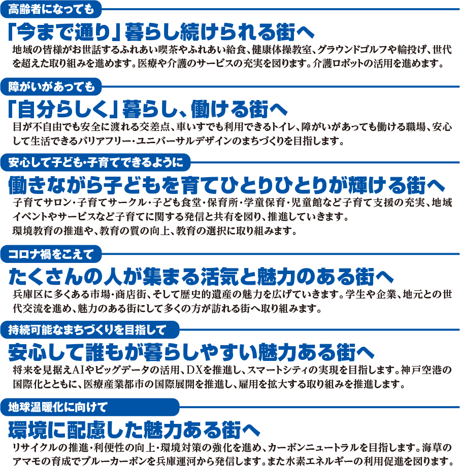 そのためには、新しい技術を活用し、市民生活の向上につなげます。そして、将来世代のためにも、環境問題、循環型社会を追求し推進していきます。そして、子育て世代、働き世代の人口を増やし、高齢の方々、障がいのある方々をお支えできる兵庫区をつくっていきたいと思っております。兵庫区に住みたい社会のあり方を作り、住みやすい街づくりをめざしていきます。
