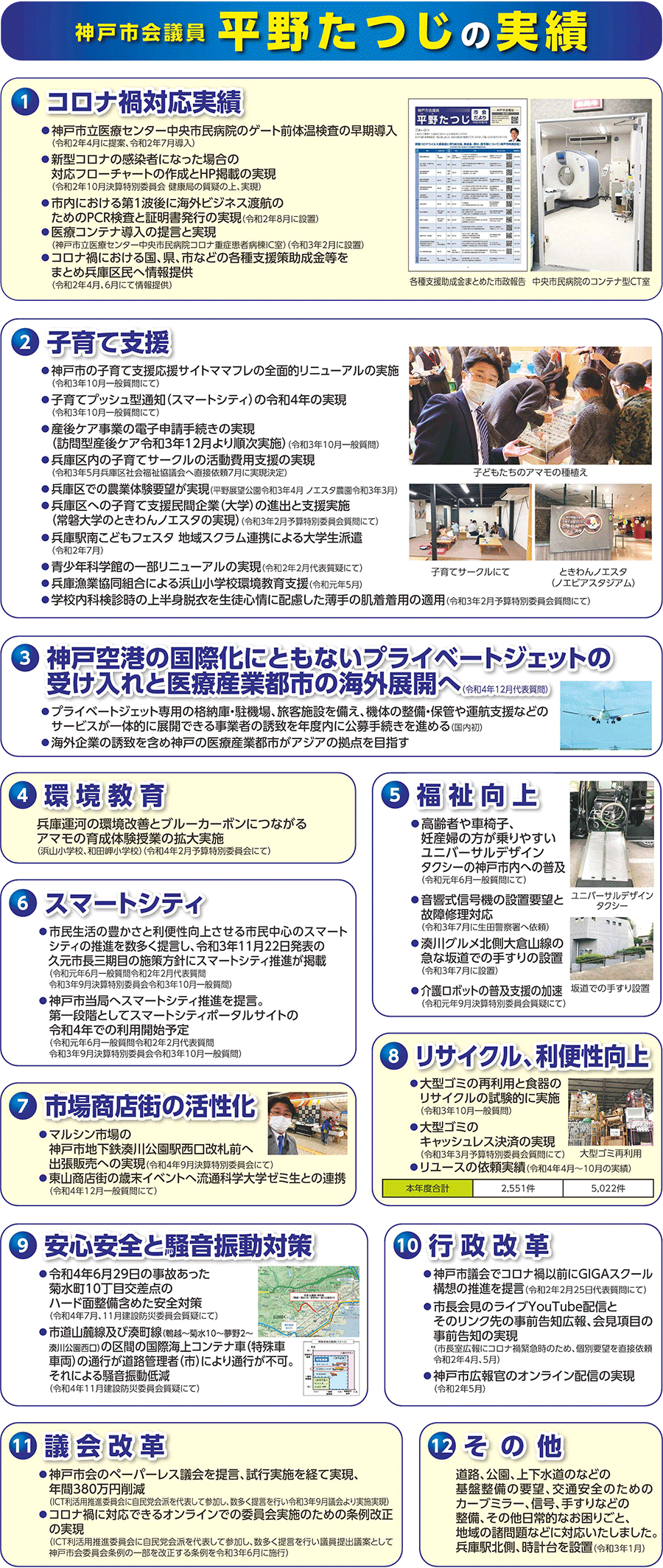 神戸市に対し、提言、提案、調整を行い、以下の通りの実績を残させていただきました。